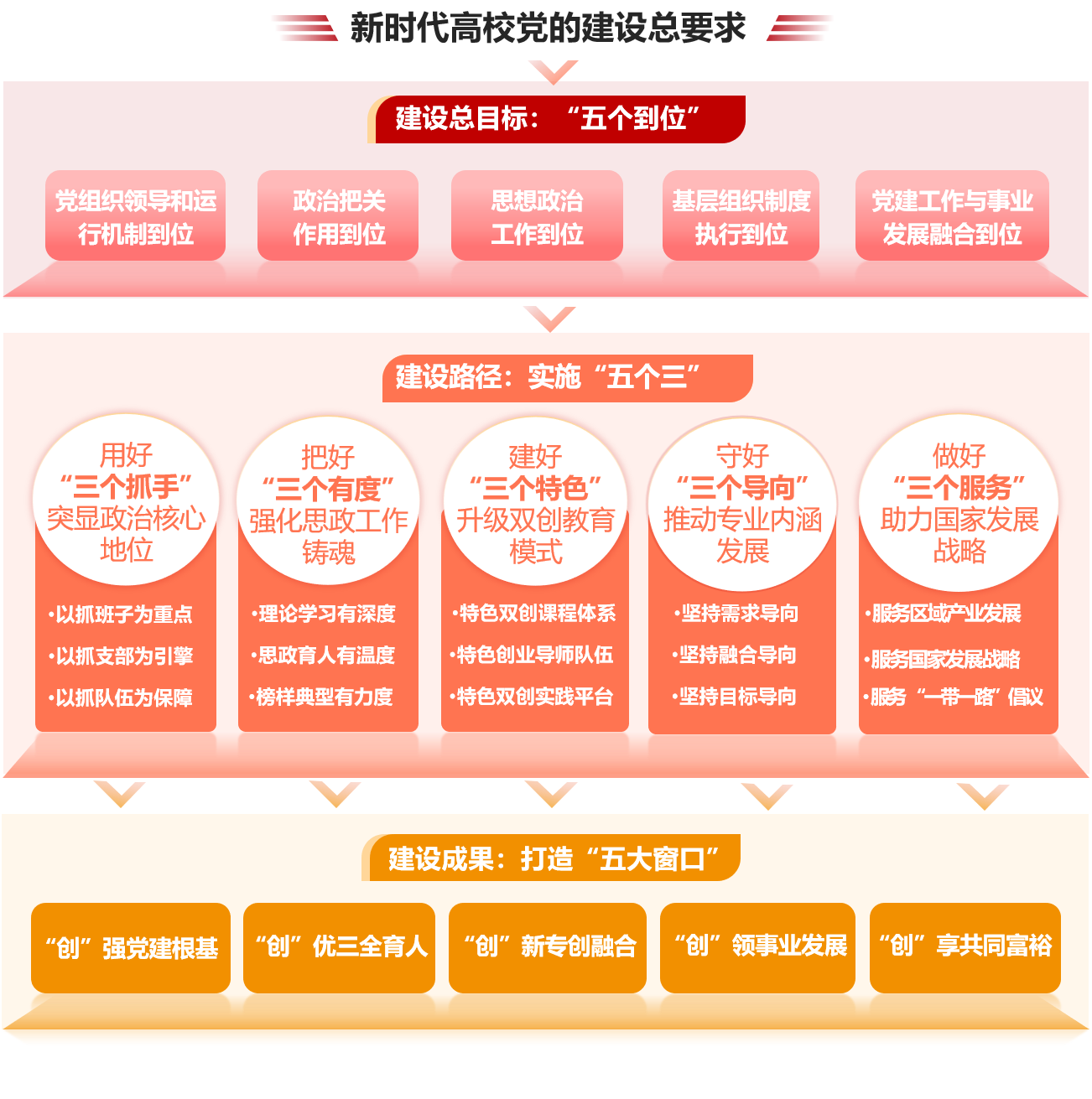 创业学院党委以习近平新时代中国特色社会主义思想为指导,对标新时代党的建设总要求和高校党建“双创”工作的任务标准,聚焦立德树人根本任务,坚持党的政治建设统领地位,深入贯彻实施“红色根脉强基”工程,立足学院创新创业教育特色,着力实施“三个抓手”“三个有度”“三个特色”“三个导向”“三个服务”的“五个三”举措,重点打造成为“创”强党建根基、“创”优三全育人、“创”新专创融合、“创”领事业发展、“创”享共同富裕的“五大窗口”,以高质量党建工作体系赋能学院事业发展,引领学院建设成为高质量创新创业人才培养高地。